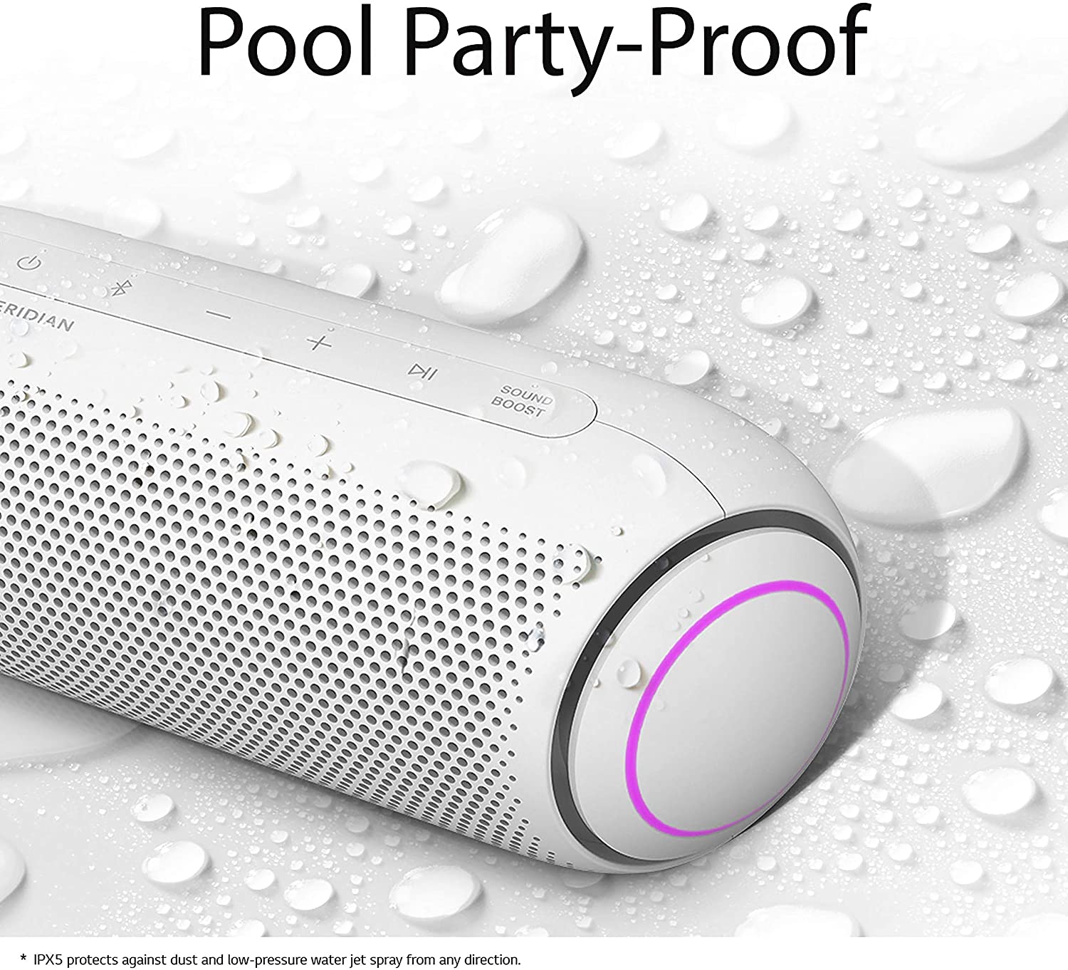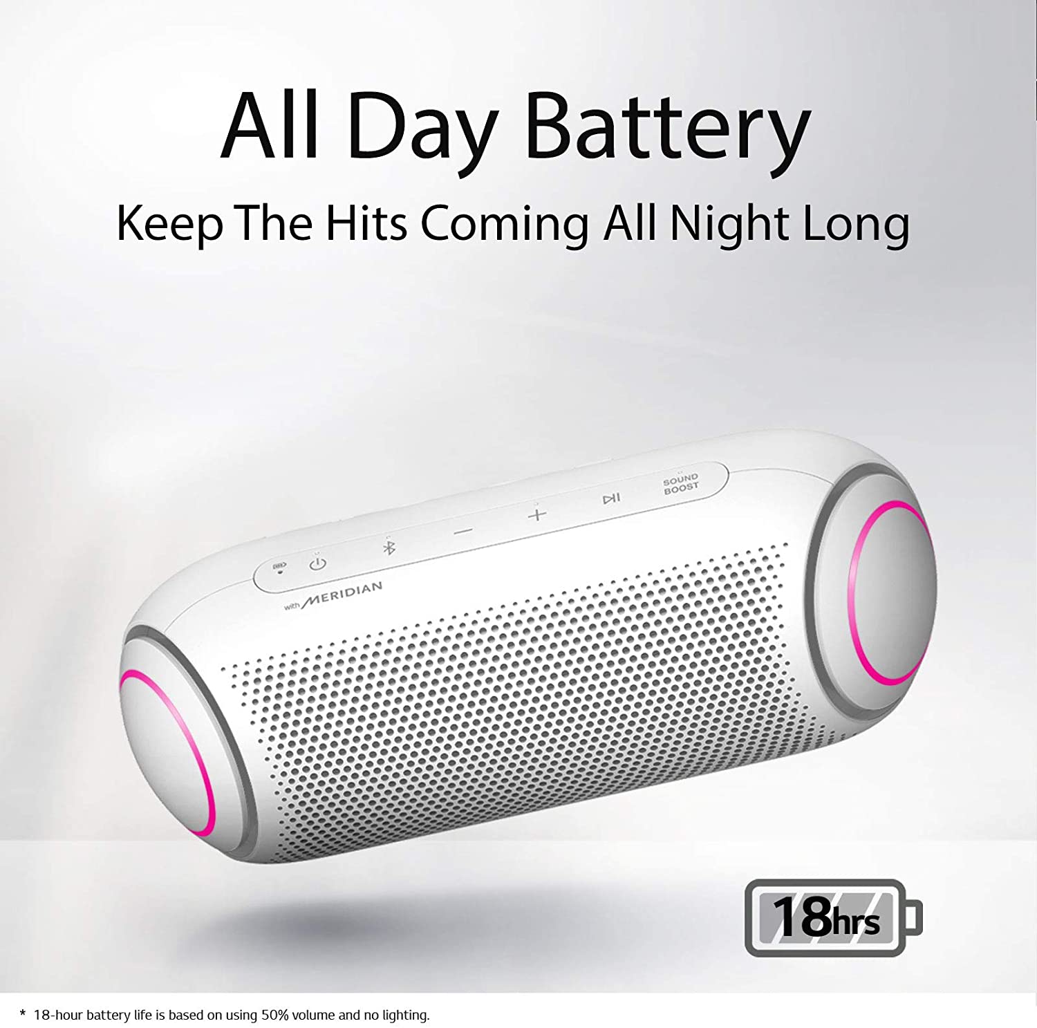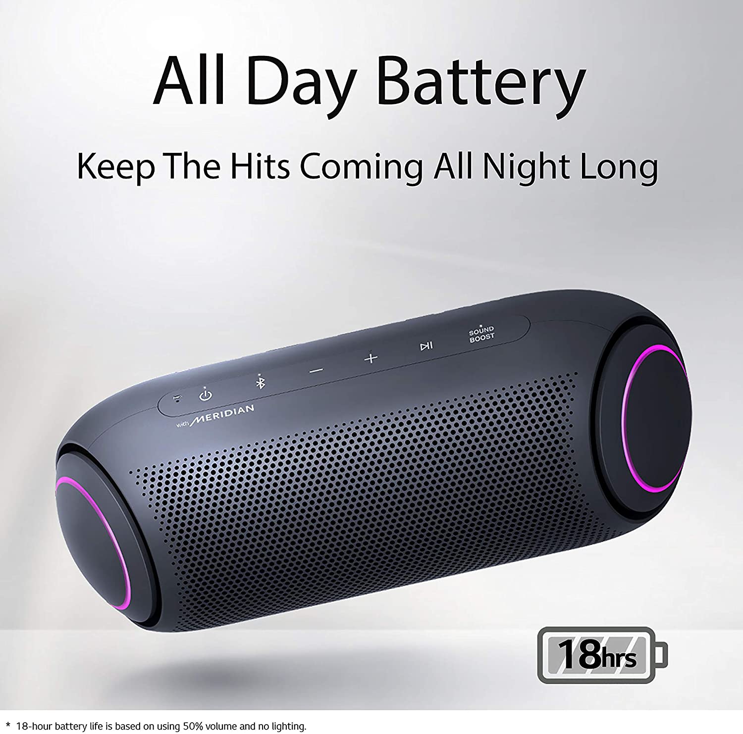 LG’s PL7, XBOOM Go portable Bluetooth speaker offers long-lasting rechargeable battery, for up to 18 hours of playback. The splash-resistant PL5 with Meridian Audio technology for richer bass and clearer vocals adds LED lights add club-style excitement. Battery life will vary with use, settings, and environmental conditions.