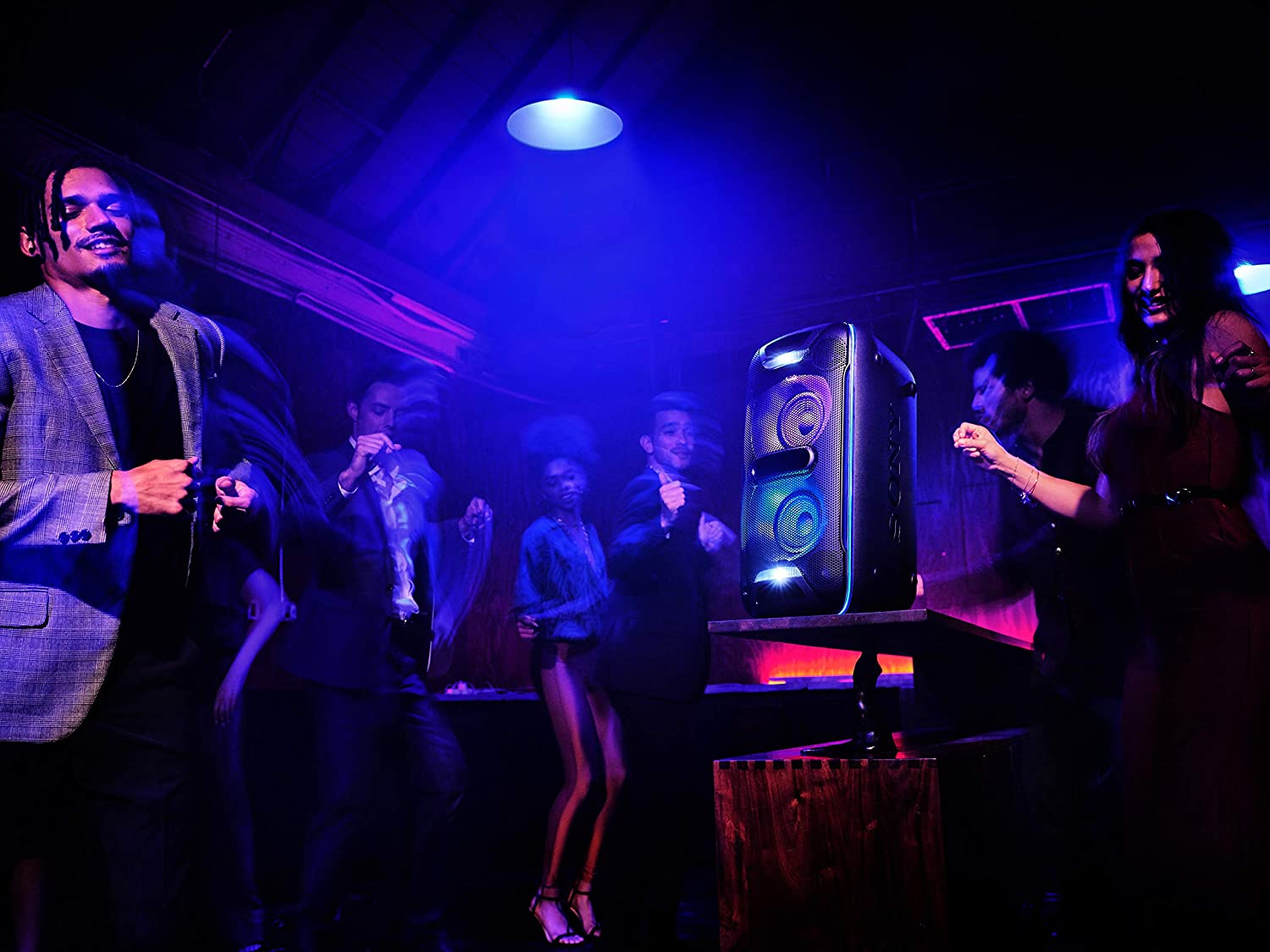 Style:GTK-XB72 | Color:Black Bring booming bass and powerful sound to the party with the XB72 high-powered one-box stereo system. Extra bass and live sound with vibrant LED lighting keep the party energy flowing. Unleash your inner pop Star with the integrated Mic input, add more speakers with wireless party chain, and charge your phone With the integrated USB port.